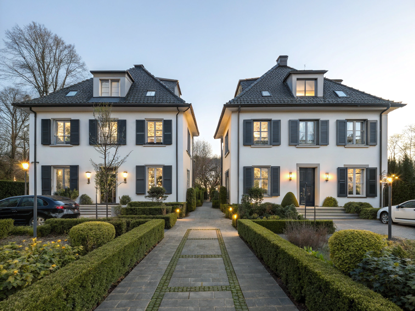 Zwei identische Doppelhaushälften mit modernem Design und großzügigen Gärten. Rohbau mit Kellergeschoss.